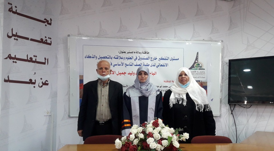 2021-04-18 تم بحمد الله وتوفيقه منح الأستاذة نداء وليد جميل مصطفى الأغا درجة الماجستير بتقدير امتياز مع مرتبة الشرف تخصص المناهج وطرق تدريس من جامعة الأقصى في قاعة السيمنار بمبنى إدارة الجامعة بغزة والتي بعنوان: مستوى التفكير خارج الصندوق في العلوم وعلاقته بالتحصيل والذكاء الانفعالي لدى طلبة الصف التاسع الأساسي في فلسطين. وتكونت لجنة المناقشة من الأساتذة الأفاضل: الأستاذ الدكتور محمود حسن الأستاذ مشرفاً ورئيساً. الأستاذ الدكتور يحيى محمد أبو جحجوح مناقشاً داخلياً. الدكتورة فدوى صبحي اللولو مناقشاً خارجياً.مع أجمل التهاني والأمنيات بالمزيد من التوفيق والسداد والنجاح، سائلين الله عز وجل أن ينتفع به العباد والبلاد.