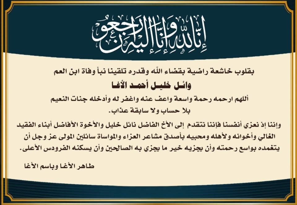 بقلوب ملؤها الإيمان بقضاءِ الله وقدره تنعى عائلة الأغا في الوطن والخارج فقيدها المغفور له بإذن الله تعالى