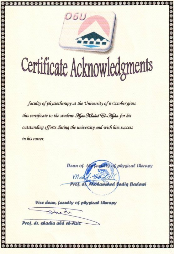 تخرجت الطالبة أية خالد أحمد خالد الأغا من جامعة 6 أكتوبر بمصر, حاملة شهادة بكالوريوس في العلاج الطبيعي.وألف مبارك