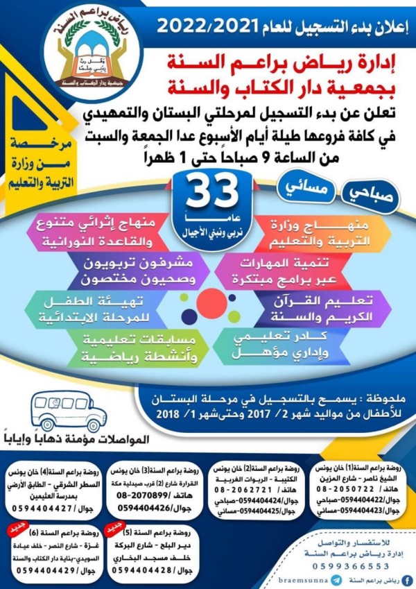 الرئيسة/إعلانات /تعلن إدارة رياض براعم السنة عن التسجيل لمرحلتي البستان والتمهيدي في جميع فروعها إعلانات تعلن إدارة رياض براعم السنة عن التسجيل لمرحلتي البستان والتمهيدي في جميع فروعها تاريخ النشر : الثلاثاء | 06-07-2021 | 23:20 2680 تعلن إدارة رياض براعم السنة - جمعية دار الكتاب والسنة عن التسجيل لمرحلتي البستان والتمهيدي في جميع فروعها للعام الدراسي 2022/2021م اضغط هنا للتواصل أو التعرف على أ. هديل بشير عثمان أحمد عثمان الأغا يمكنك تلقي أحدث الأخبار أول بأول بانضمامك لإحدى مجموعات الواتساب الخاصة بالعائلة من خلال الضغط هنـا اظهر المزيد