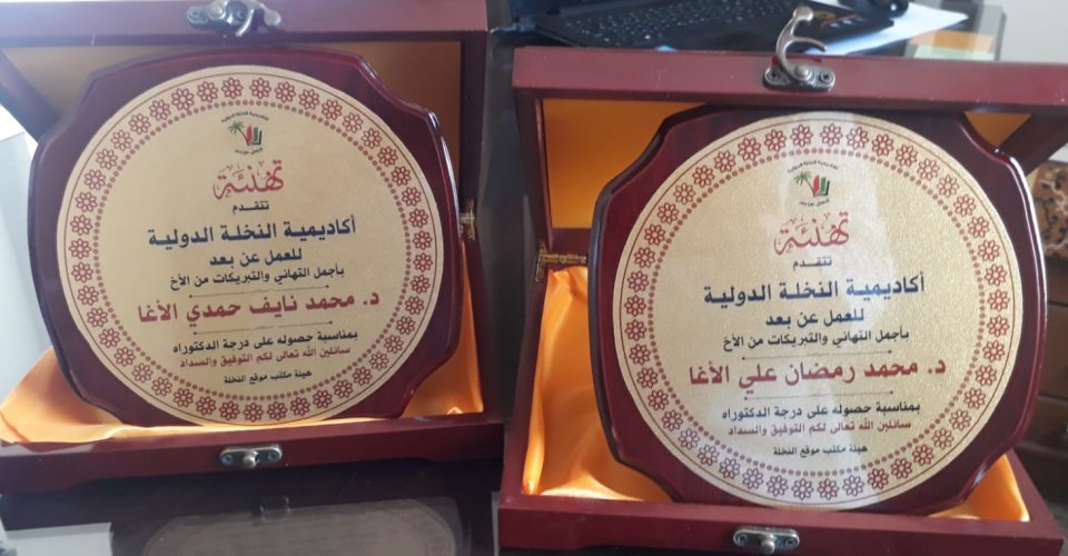 أكاديمية النخلة الدولية تكرم الأخوين ،د. محمد حمدي نايف الاغا، و د. محمد رمضان علي الاغا بمناسبة حصولهما على درجة الدكتوراه