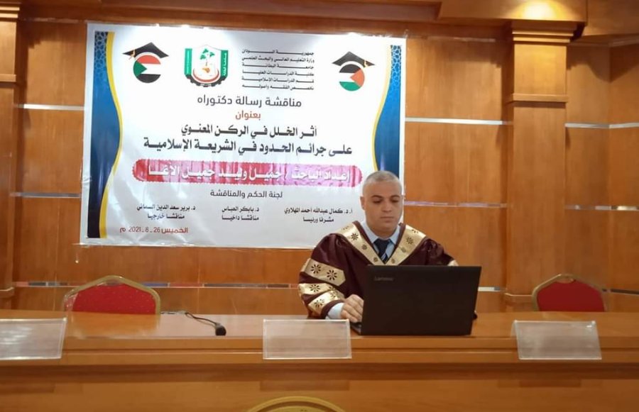 2021-08-26 تم بحمد الله وتوفيقه منح الدكتور جميل وليد جميل مصطفى الأغا درجة الدكتوراة تخصص الفقه وأصوله من جامعة البطانة مع أجمل التهاني والأمنيات بالمزيد من التوفيق والسداد والنجاح، سائلين الله عز وجل أن ينتفع به العباد والبلاد. عبر الفيديو كونفرنس، وقد تفضلت جامعة الإسراء مشكورة بإستضافة المناقشة،، والحمد لله رب العالمين.