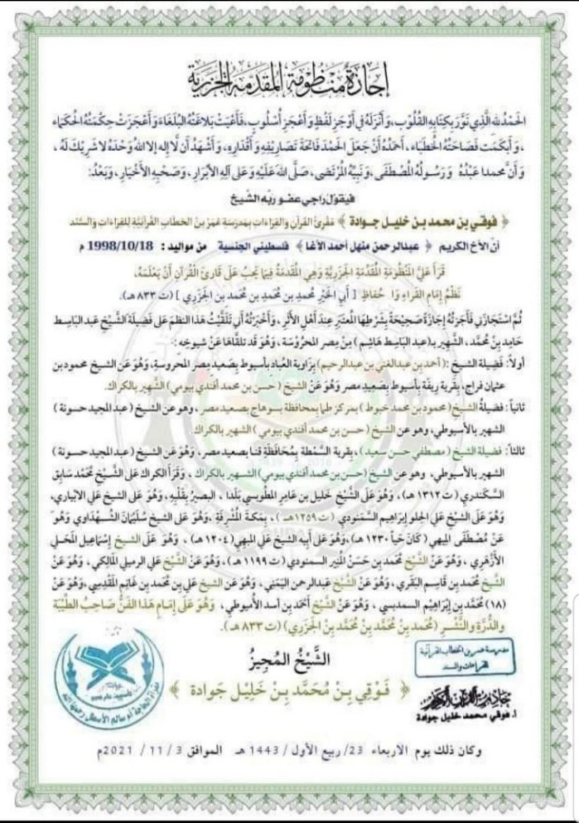 تم بفضل من الله سبحانه وتعالى إجازة لإبننا الخلوق الفاضل عبد الرحمن منهل أحمد الأغا، الحافظ لكتاب الله، فلسطينى الجنسية، بمتن منظومة المقدمة الجزرية للإمام إبن الجزرى رحمه الله، وذلك عن فضيلة الشيخ فوقى محمد جوادة، المجاز بالعديد من الأسانيد بالقراءات العشر الصغرى والكبرى والمتون، نبارك له هذا الجهد وأن ينفع الله به المسلمين.