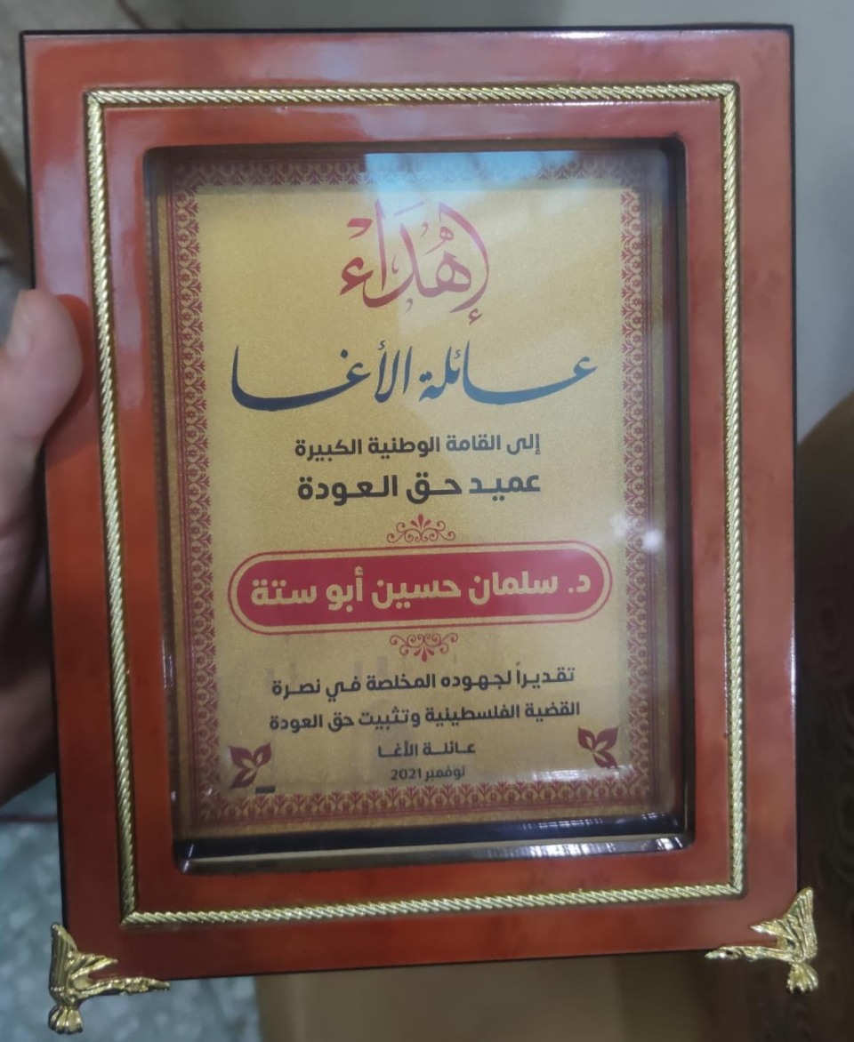 كرّمت عائلة الأغا، الأربعاء، 10 نوفمبر 2021، المؤرخ الفلسطيني ورئيس هيئة أرض فلسطين، د. سليمان حسين أبو ستة، تقديرًا لجهوده في الدفاع عن الشعب الفلسطيني وقضيته العادلة على مدار أكثر من 30 عاما.