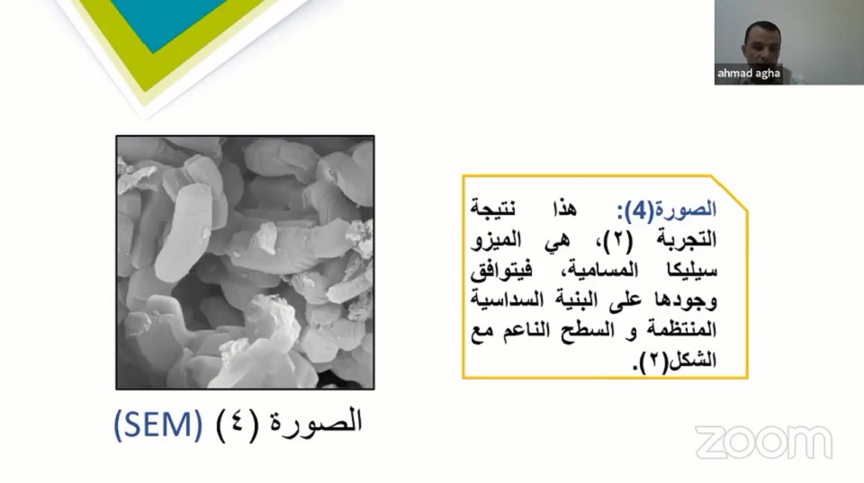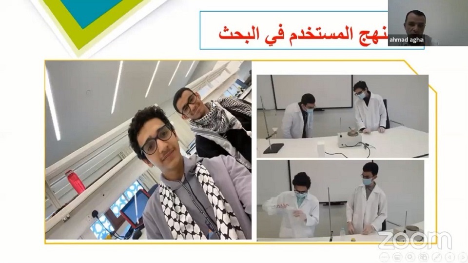 وتحدث الأستاذ أحمد، مشرف البحث المعنون بـ "تأثير جسيمات الفضة النانونية المحملة على سطح الميزو سيليكا المسامية النانونية على نشاط الميكروبات (علاج مقترح لفيروس كورونا)"، والذي قدم باسم المدرسة الفلسطينية في قطر، وجرى إعداده من قبل الطالبين مصطفى أحمد الخريبي، وإبراهيم هاشم الزريعي.