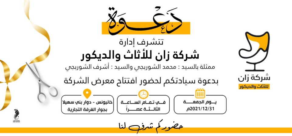 الرئيسة/إعلانات /دعوة لحضور افتتاح شركة زان للأثاث والديكور إعلانات دعوة لحضور افتتاح شركة زان للأثاث والديكور تاريخ النشر : الإثنين | 27-12-2021 | 10:50 3986 دعوة لحضور افتتاح شركة زان للأثاث والديكور اضغط هنا للتواصل او التعرف على السيد أشرف بسام إسليم حسن إسليم الشوربجي اضغط هنا للتواصل أو التعرف على السيد محمد خميس سعيد يوسف مصطفى صالح الشوربجي يمكنك تلقي أحدث الأخبار أول بأول بانضمامك لإحدى مجموعات الواتساب الخاصة بالعائلة من خلال الضغط هنـا اظهر المزيد