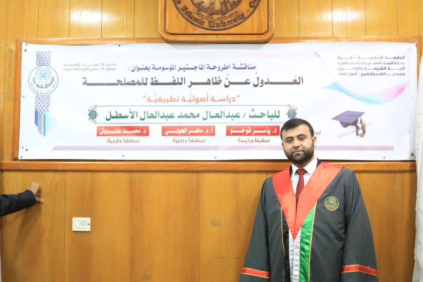 2022-01-23 تم بحمد الله وتوفيقه منح الأستاذ عبدالعال محمد عبدالعال الأسطل درجة الماجستيرفي أصول الفقه من كلية الشريعة والقانون من الجامعة الاسلامية مع أجمل التهاني والأمنيات بالمزيد من التوفيق والسداد والنجاح، سائلين الله عز وجل أن ينتفع به العباد والبلاد.