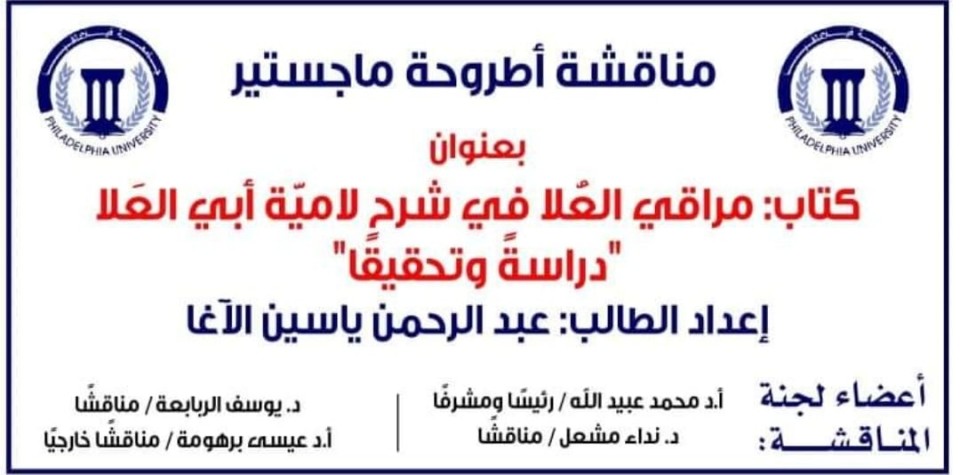 2022-01-23 تم بحمد الله وتوفيقه منح المهندس عبدالرحمن ياسين عنتر شاكر الأغا درجة الماجستير من جامعة فلادلفيا مع أجمل التهاني والأمنيات بالمزيد من التوفيق والسداد والنجاح، سائلين الله عز وجل أن ينتفع به العباد والبلاد.