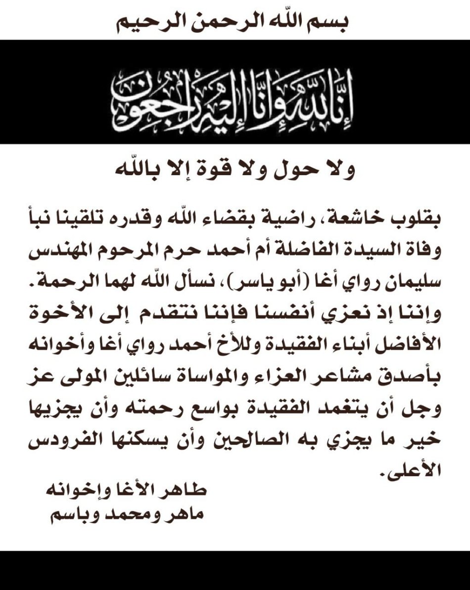 - بيت العزاء: بمنزل المستشار عبدالفتاح رواي الأغا عصرا شارع رواي بالسطر الشرقي