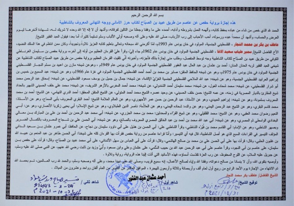 حصول المحفظ لكتاب الله سمير طياب سعيد الاغا على اجازة السند المتصل الى رسول الله صلى الله عليه وسلم برواية حفص عن عاصم من طريق الشاطبية