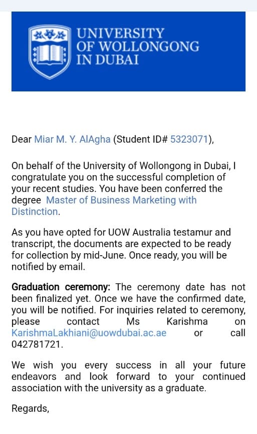 2021-12-12 تم بحمد الله وتوفيقه منح الأستاذ ميار منار يوسف علي عثمان الأغا درجة الماجستير تخصص ادارة اعمال من جامعة wollongong university مع أجمل التهاني والأمنيات بالمزيد من التوفيق والسداد والنجاح، سائلين الله عز وجل أن ينتفع به العباد والبلاد.