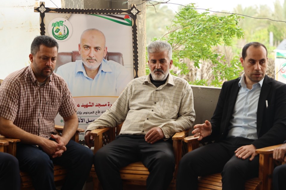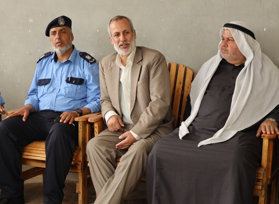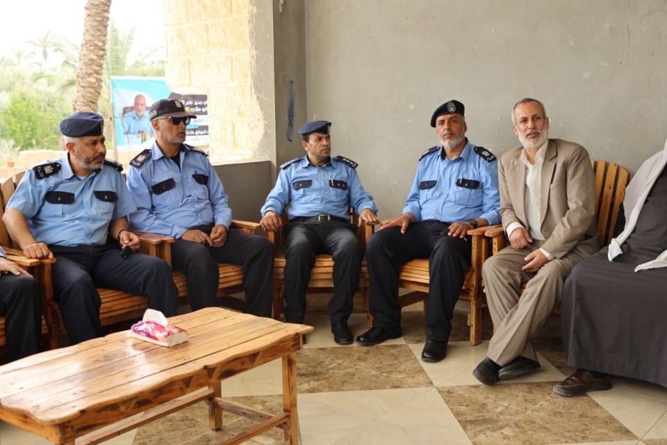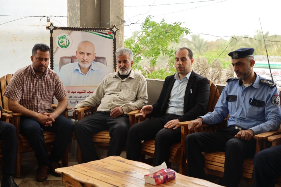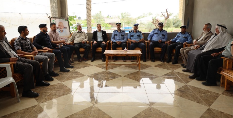 وفد من قيادة الشرطة ومدير مكتب اللواء محمود صلاح في زيارة عائلة الاغا وكان في إستقبالهم مختار العائلة وفضيلة القاضي محمد عبد المعطي الاغا وأسرة المرحوم الملازم عدنان جميل الأغا.