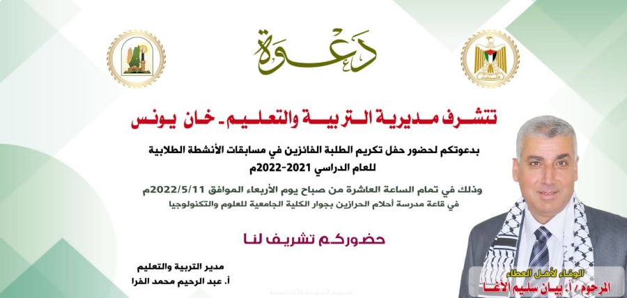 الرئيسة/تكريم/دعوة لحضور حفل تكريم الفائزين في مسابقات الأنشطة الطلابية وفاءً للمرحوم أ. بيان الأغا تكريم دعوة لحضور حفل تكريم الفائزين في مسابقات الأنشطة الطلابية وفاءً للمرحوم أ. بيان الأغا تاريخ النشر : الإثنين | 09-05-2022 | 07:56 3146 اضغط هنا للتعرف على المرحوم أ. بيان سليم إبراهيم سليم الأغا يمكنك تلقي أحدث الأخبار أول بأول بانضمامك لإحدى مجموعات الواتساب الخاصة بالعائلة من خلال الضغط هنـا اظهر المزيد