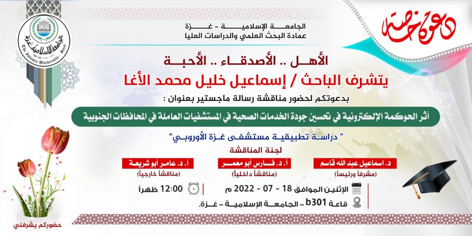 2022-07-20 تم بحمد الله وتوفيقه منح المهندس إسماعيل خليل محمد بخيت الأغا درجة الماجستير تخصص هندسة مع أجمل التهاني والأمنيات بالمزيد من التوفيق والسداد والنجاح، سائلين الله عز وجل أن ينتفع به العباد والبلاد.