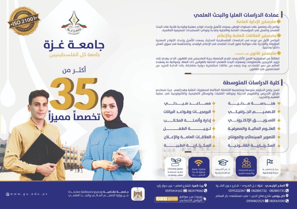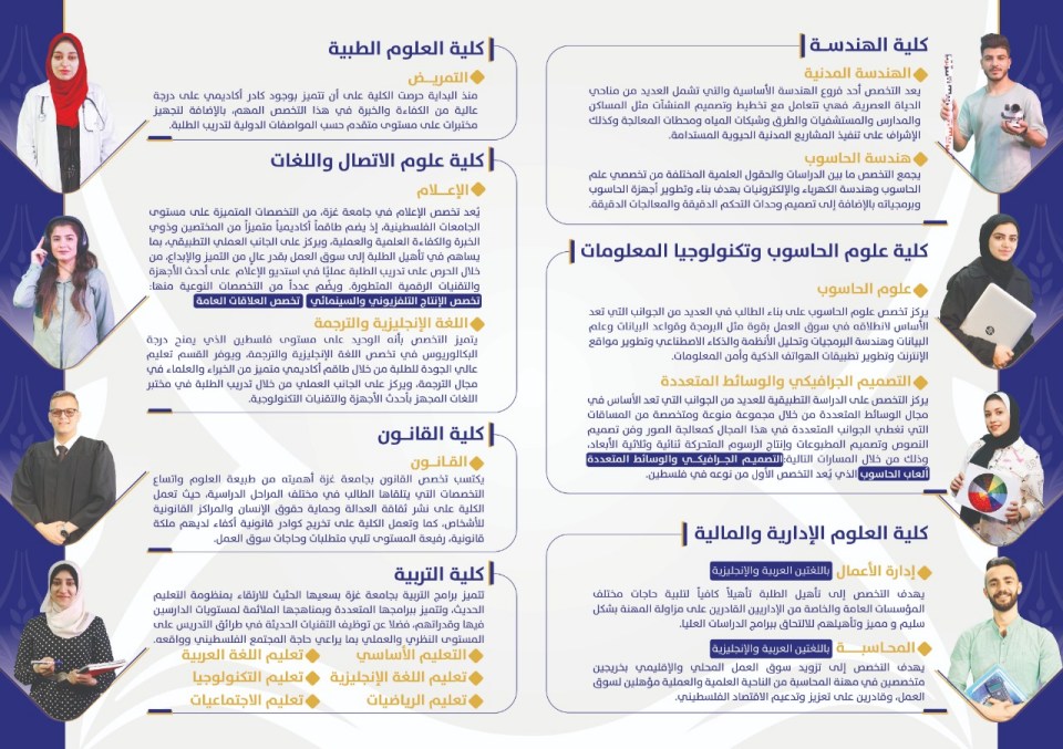 جامعة غزة لديها 8 كليات تمنح درجة الماجستير والبكالوريوس والدبلوم المتوسط في 35 تخصصا نوعيا.
