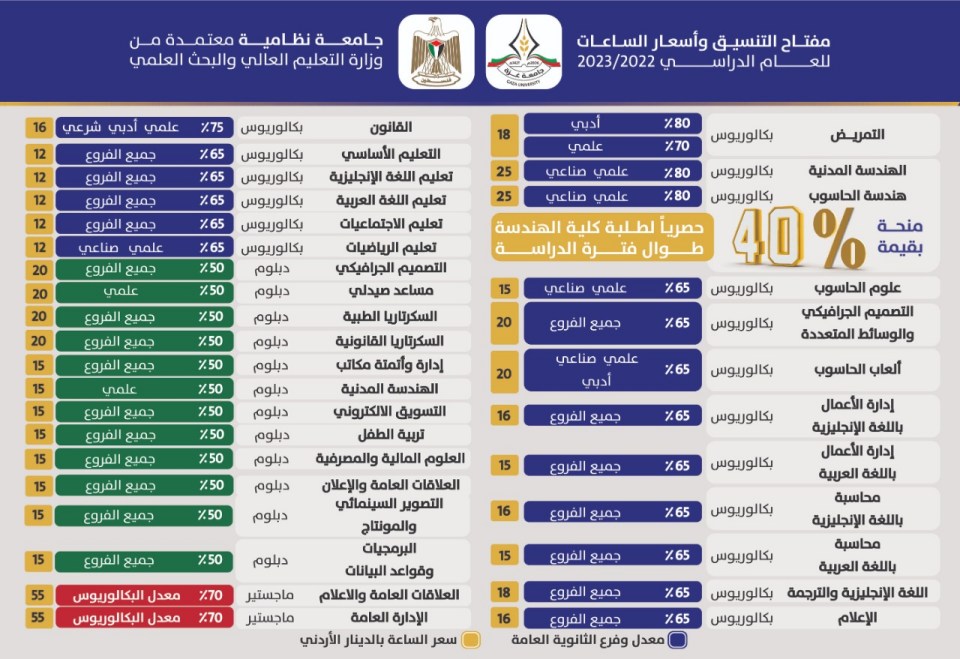 تبارك لكم نجاحكم وتفوقكم في امتحانات الثانوية العامة وترحب بكم وتسعد بإنضمامكم لبرامجها وتخصصاتها النوعية والمتميزة المعتمدة من وزارة التعليم العالي والبحث العلمي برام الله.