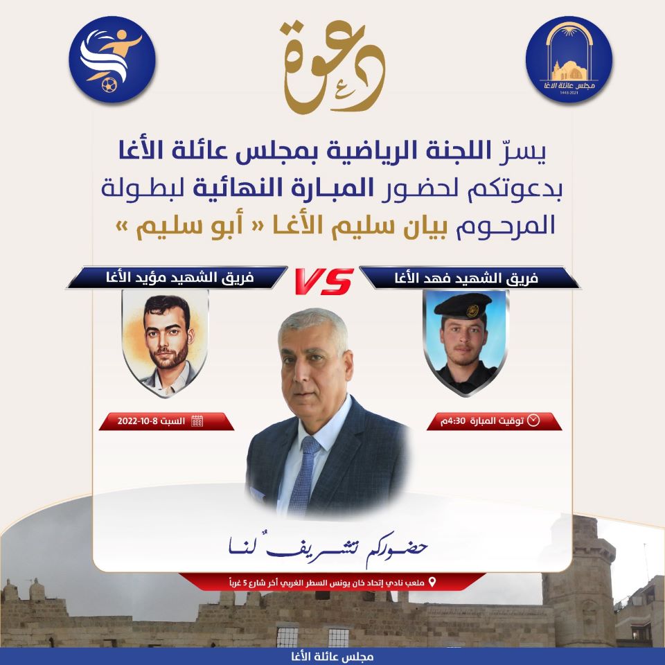 الرئيسة/رياضة/دعوة لحضور المباراة النهائية لبطولة المرحوم بيان الاغا ابو سليم رياضة دعوة لحضور المباراة النهائية لبطولة المرحوم بيان الاغا ابو سليم تاريخ النشر : الخميس | 06-10-2022 | 11:01 2453 اضغط هنا للتعرف على المرحوم أ. بيان سليم إبراهيم سليم الأغا يمكنك تلقي أحدث الأخبار أول بأول بانضمامك لإحدى مجموعات الواتساب الخاصة بالعائلة من خلال الضغط هنـا اظهر المزيد