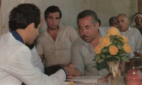 أ. عبد الرحيم محمد مصافحا فريد الأزعر يوم عقد قرانه على كريمة الأستاذ عبد الرحيم ، يوسف حسني