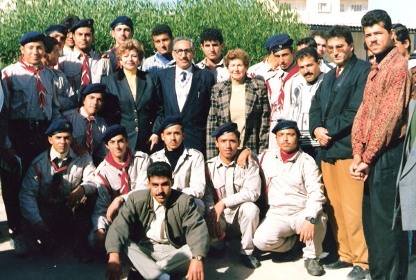 فرق الجوالة في مدرسة كلية غزة الثانوية مع بعض المدرسين وتظهرالسيدة أم مروان الترزي صاحبة المدرسة والأستاذ الشاعر عمر خليل عمر مدير المدرسة والسيدة انتصار الوزير أم جهاد