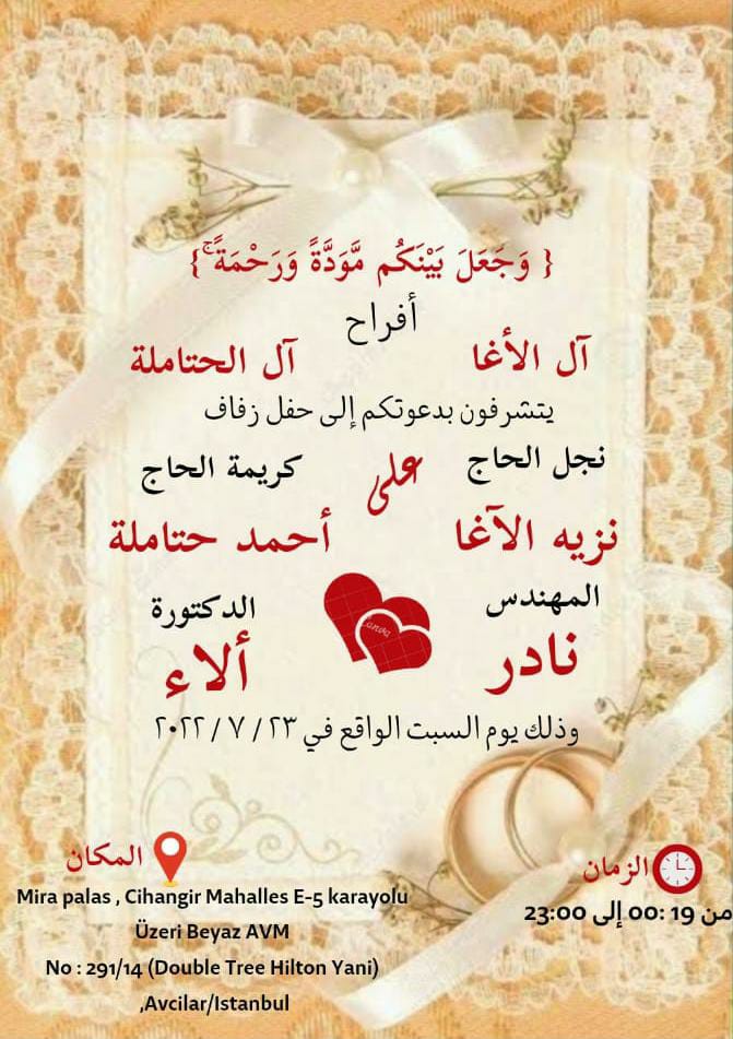 اسطنبول-2022-7-23♥ بِسْمِ اللَّـهِ الرَّحْمَـٰنِ الرَّحِيمِ ♥ وَمِنْ آيَاتِهِ أَنْ خَلَقَ لَكُم مِّنْ أَنفُسِكُمْ أَزْوَاجًا لِّتَسْكُنُوا إِلَيْهَا وَجَعَلَ بَيْنَكُم مَّوَدَّةً وَرَحْمَةً إِنَّ فِي ذَلِكَ لَآيَاتٍ لِّقَوْمٍ يَتَفَكَّرُون♥ تم بحمد الله وتوفيقه زفاف المهندس نادر نزيه جميل مصطفى الأغا إلى صاحبة الصون والعفاف الآنسة الدكتورة الأء احمد فندي حتاملة ♥ بارك الله لكما وبارك عليكما وجمع بينكما فى خير.♥