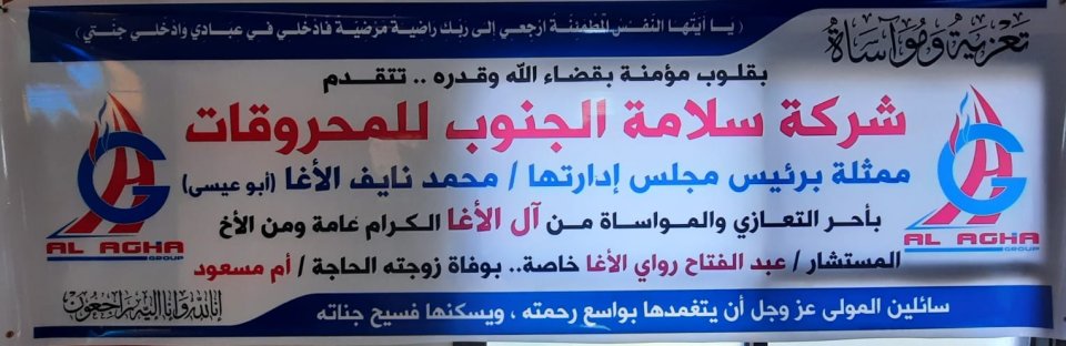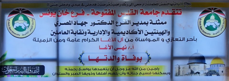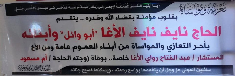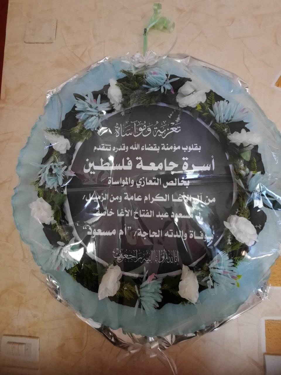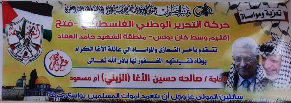 (( وَلَنَبْلُوَنَّكُمْ بِشَيْءٍ مِّنَ الْخَوفْ وَالْجُوعِ وَنَقْصٍ مِّنَ الأَمَوَالِ وَالأنفُسِ وَالثَّمَرَاتِ وَبَشِّرِالصَّابِرِينَ الَّذِينَ إِذَا أَصَابَتْهُم مُّصِيبَةٌ قَالُواْ إِنَّا لِلّهِ وَإِنَّا إِلَيْهِ رَاجِعونَ أُولَئِكَ عَلَيْهِمْ صَلَوَاتٌ مِّن رَّبِّهِمْ وَرَحْمَةٌ وَأُولَئِكَ هُمُ الْمُهْتَدُونَ )) لانملك إلا أن نقول :" إنا لله وإنا إليه راجعون ، اللهم آجرنا في مصيبتنا وأخلف لنا خيرا منها.. يتقدم المستشار عبد الفتاح الأغا وأبنائه والعائلة بجزيل الشكر لكل من قدم لنا التعزية الصادقة والمواساة الحسنة، في وفاة زوجته الحاجة / صالحة حسين حسن الاغا ( الزيني)