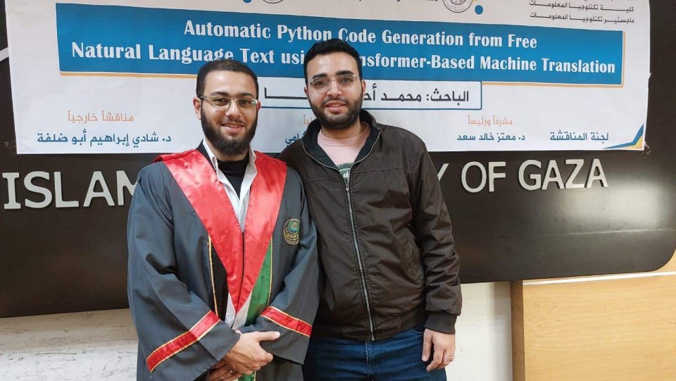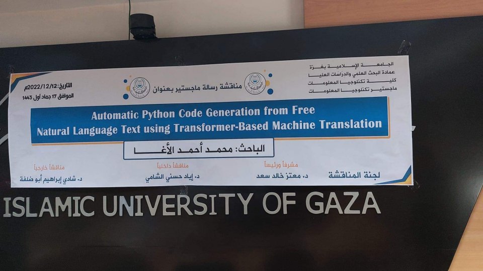 2022-12-18 تم بحمد الله وتوفيقه منح الأستاذ محمد أحمد مصطفى أحمد مصطفى الأغا درجة الماجستير تخصص حاسوب من الجامعة الاسلامية، بعد مناقشة بحثا بعنوان: التوليد الآلي للرموز البرمجية بلغة بايثون من النصوص المكتوبة باللغة الطبيعية، باستخدام الترجمة الآلية القائمة على المحولات، وقد تكونت لجنة المناقشة من: مشرفا ورئيسا الدكتور معتز سعد، مناقش داخلي د. اياد الشامي، مناقش خارجي د. شادي ابو ضلفة. مع أجمل التهاني والأمنيات بالمزيد من التوفيق والسداد والنجاح، سائلين الله عز وجل أن ينتفع به العباد والبلاد.