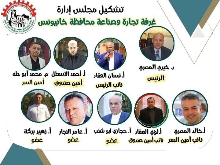 تم الثلاثاء الموافق 3/1/2023 توزيع المناصب الإدارية في غرفة تجارة خان يونس بحضور السيد جمال جوابرة امين عام اتحاد الغرف التجارية الفلسطينية والسيد ايهاب حاج ياسين مدير عام وحدة القطاع الخاص رام الله والسيد محمد فريد ابو عرام مدير عام للشئون الإدارية والمالية في وزارة الاقتصاد رام الله والسيد تامر الزويدي مدير عام وحدة التنسيق في وزارة الاقتصاد في قطاع غزة، حيث تم انتخاب: