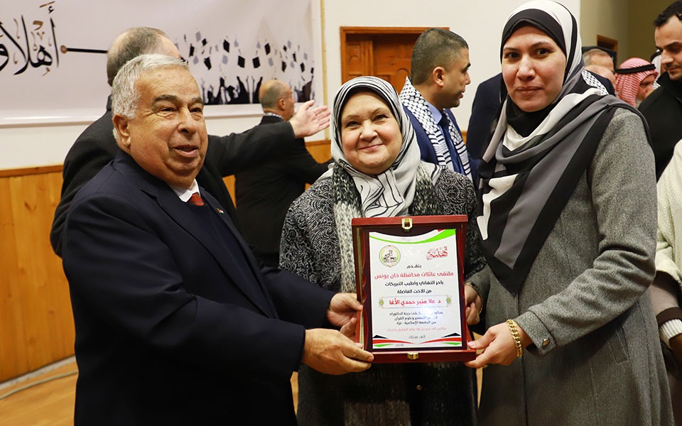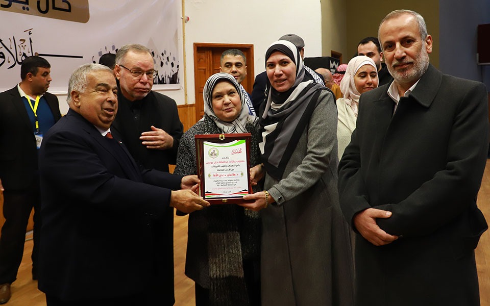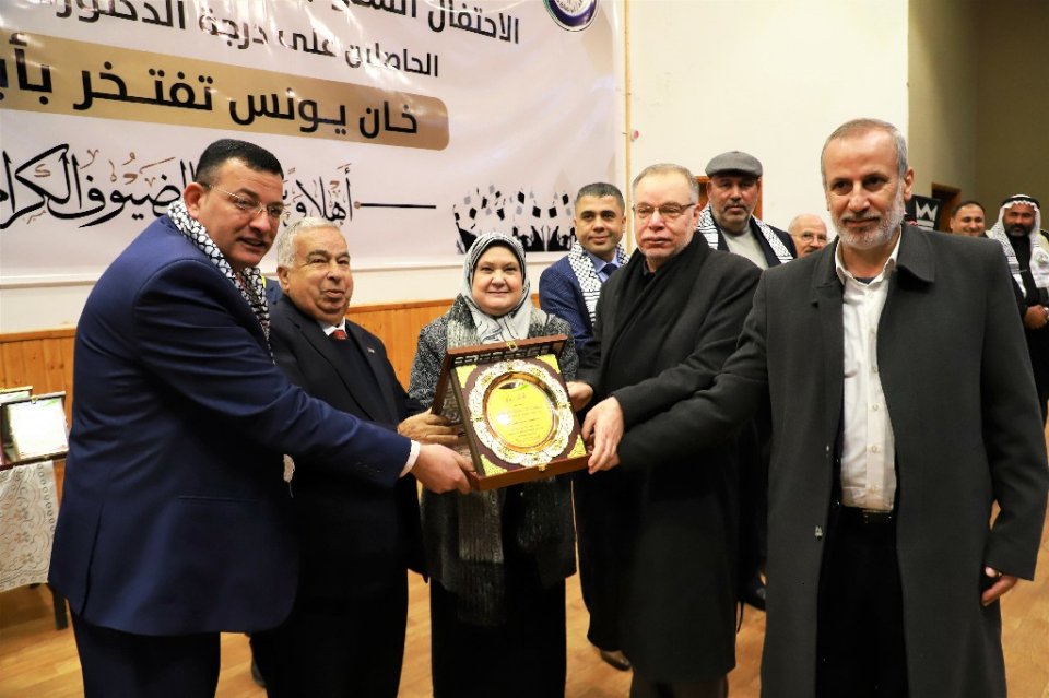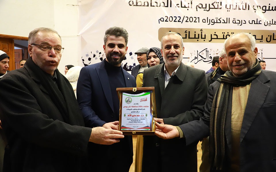 خان يونس - نظم ملتقى عائلات محافظة خان يونس، الاحتفال السنوي الثاني لتكريم أبناء المحافظة الحاصلين على درجة الدكتوراه خلال العام الجامعي 2022/2021م، تحت شعار "خان يونس تفتخر بأبنائها"، برعاية كريمة من شركة همسات للصرافة والحوالات المالية، وذلك في قاعة المركز الثقافي بخان يونس، بحضور محافظ محافظة خان يونس معالي الدكتور أحمد الشيبي ممثل فخامة الرئيس محمود عباس، ومعالي الأستاذ الدكتور محمد رمضان الأغا، ومعالي الدكتورة هيفاء الأغا، وسعادة الدكتور أسامة الفرا، والدكتور علي أبو سعدة مدير عام التعليم الجامعي في وزارة التعليم العالي، والدكتور نورهان العقاد منسق عام ملتقى عائلات محافظة خان يونس، والدكتور خيري المصري رئيس الغرفة التجارية بخان يونس، والدكتور حاتم العسولي مدير جامعة غزة بخان يونس، والدكتور أكرم شعت مدير جامعة فلسطين بخان يونس، والشيخ طارق الأسطل رئيس رابطة علماء فلسطين بخان يونس، ولفيف من الوجهاء والمخاتير والشخصيات الوطنية والاعتبارية، و ممثلى الهيئة الوطنية للمتقاعدين العسكريين ومركز نادي الزمالك الرياضي، وأعضاء الملتقى والأخوة والأخوات المحتفى بهم وذويهم.