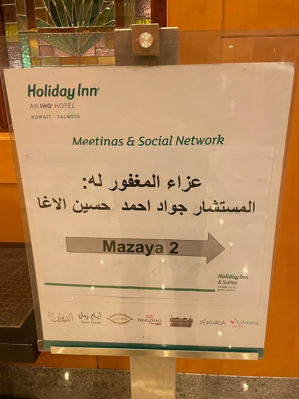 الرئيسة/في ذمة الله/الكويت - جانب من بيت عزاء المستشار جواد الأغا في ذمة الله الكويت - جانب من بيت عزاء المستشار جواد الأغا تاريخ النشر : السبت | 04-02-2023 | 15:13 4723 الكويت- فندق هوليدي ان- جانب من بيت عزاء المستشار جواد أحمد الأغا يرحمه الله. اضغط هنا للتعرف على المرحوم أ. جواد أحمد حسين الأغا يمكنك تلقي أحدث الأخبار أول بأول بانضمامك لإحدى مجموعات الواتساب الخاصة بالعائلة من خلال الضغط هنـا اظهر المزيد