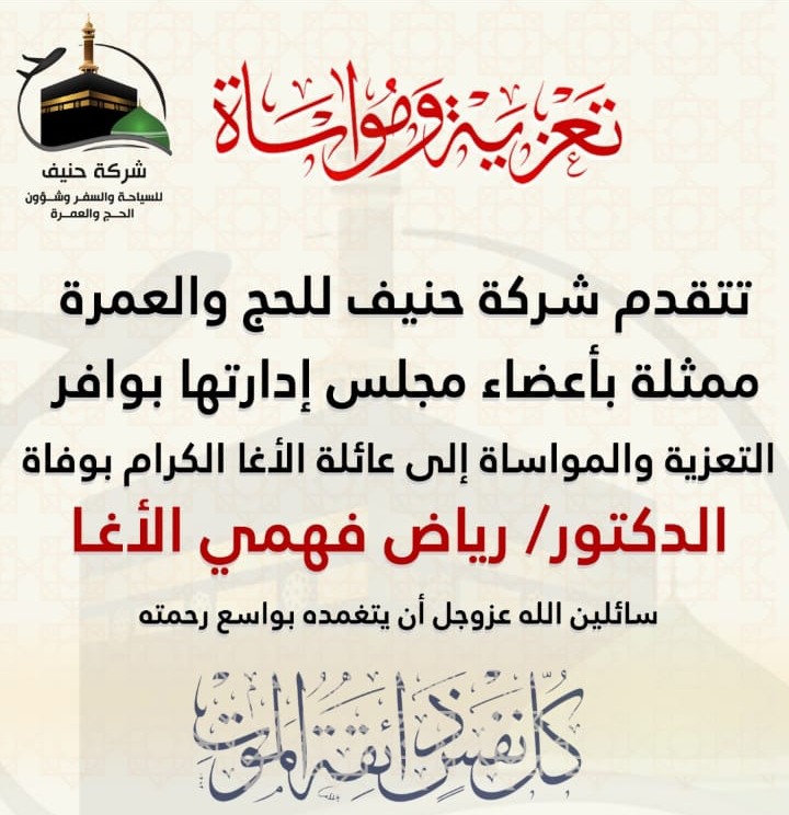 الذي انتقل إلى رحمة الله تعالى. نسأل الله العلي القدير أن يتغمده بواسع رحمته وأن يسكنه فسيح جناته، وأن يلهم أهله وذويه جميل الصبر والسلوان. اللهم اغفر له وارحمه رحمة واسعة طيبة مبارك فيها تليق بجلال وجهك وعظيم سلطانك يا رب العالمين، اللهمّ أبدله داراً خيراً من داره وأدخله الجنّة بسلام، اللهم ثبته عند السؤال وأعذه من عذاب القبر ومن عذاب النّار، اللهمّ عامله بما أنت أهله ولا تعامله بما هو أهله، اللهم انك غني عن تعذيبه فلا تعذبه، اللهم اجعل قبره روضه من رياض الجنة، اللهم اجعله من ورثة جنات النعيم. إِنَّا لِلَّهِ وَإِنَّا إِلَيْهِ رَاجِعُونَ، ولا حَوْلَ وَلا قُوَّةَ إِلَّا بِاللهِ العلي العظيم.