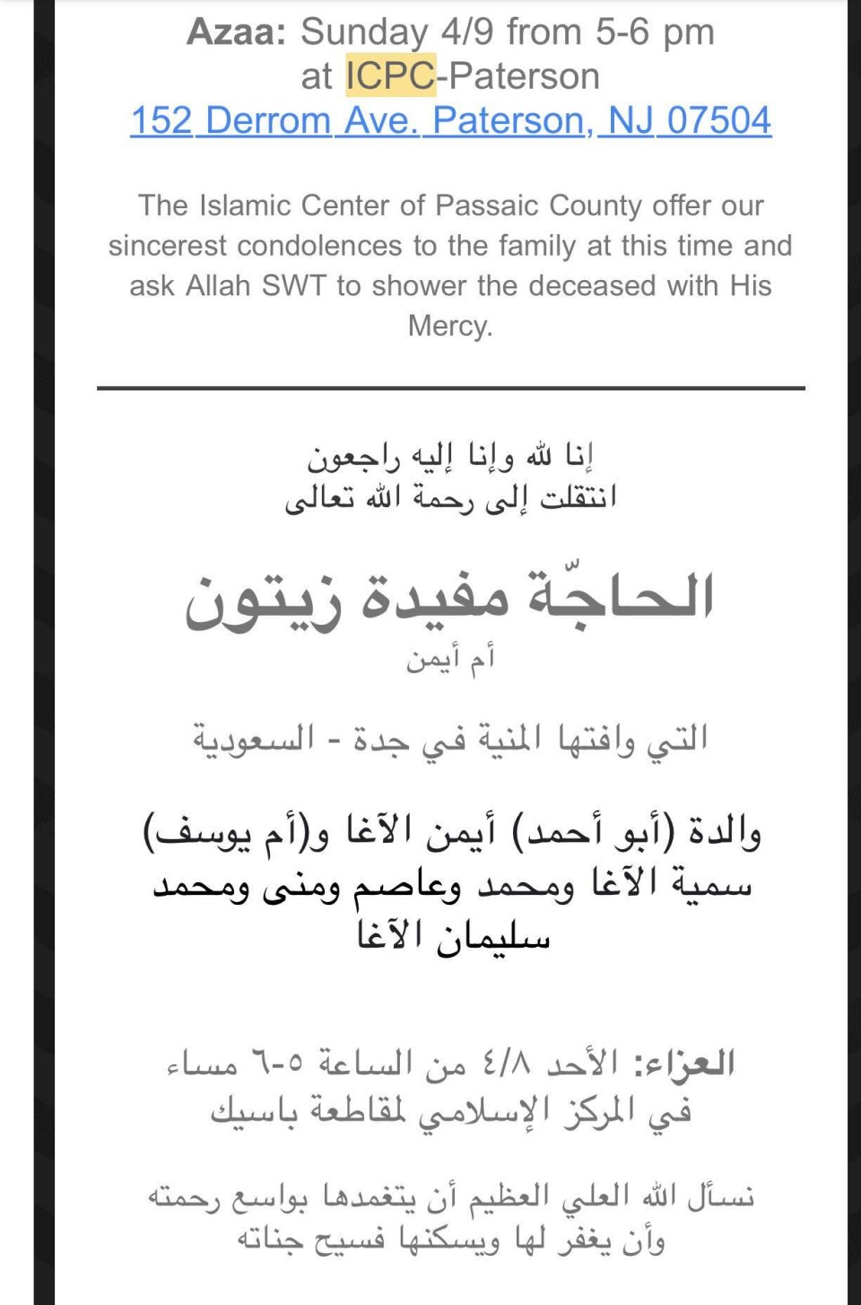 التي انتقلت إلى رحمة الله تعالى. نسأل الله العلي القدير أن يتغمدها بواسع رحمته وأن يسكنها فسيح جناته، وأن يلهم أهلها وذويها جميل الصبر والسلوان. اللهم اغفر لها وارحمها رحمة واسعة طيبة مبارك فيها تليق بجلال وجهك وعظيم سلطانك يا رب العالمين، اللهمّ أبدلها داراً خيراً من دارها وأدخلها الجنّة بسلام، اللهم ثبتها عند السؤال وأعذها من عذاب القبر ومن عذاب النّار، اللهمّ عاملها بما أنت أهله ولا تعاملها بما هي أهله، اللهم انك غني عن تعذيبها فلا تعذبها، اللهم اجعل قبرها روضه من رياض الجنة، اللهم اجعلها من ورثة جنات النعيم. إِنَّا لِلَّهِ وَإِنَّا إِلَيْهِ رَاجِعُونَ، ولا حَوْلَ وَلا قُوَّةَ إِلَّا بِاللهِ العلي العظيم.