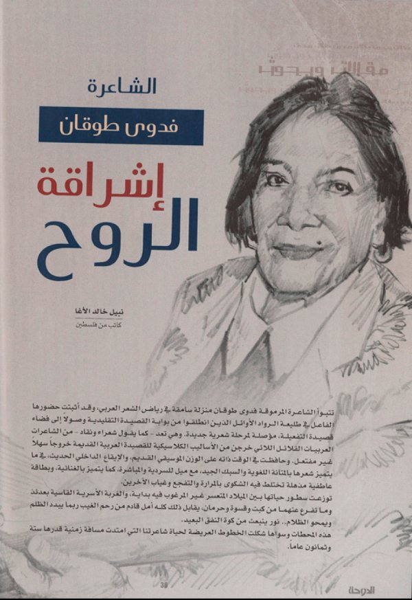 للاخ نبيل خالد الاغا بعنوان ( الشاعرة فدوى طوقان اشراقة الروح ) وتضمن شرحا مشوقا