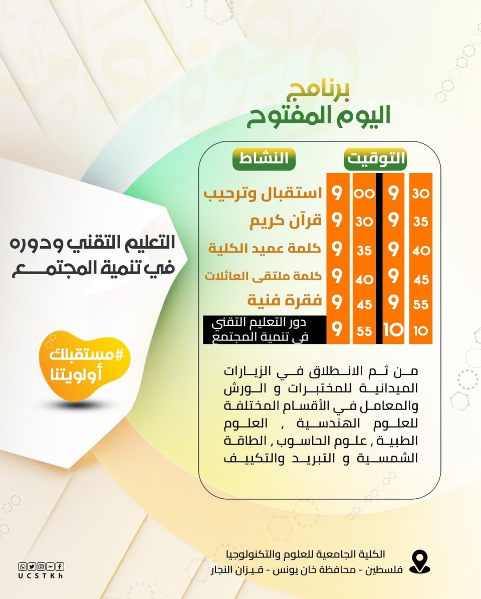 اليوم المفتوح : (دور التعليم التقني في تنمية المجتمع) بالكلية الجامعية للعلوم والتكنولوجيا – خان يونس بالشراكة مع ملتقى عائلات محافظة خان يونس وذلك يوم الخميس الموافق 27-7-2023م - الساعة: 9 صباحًا