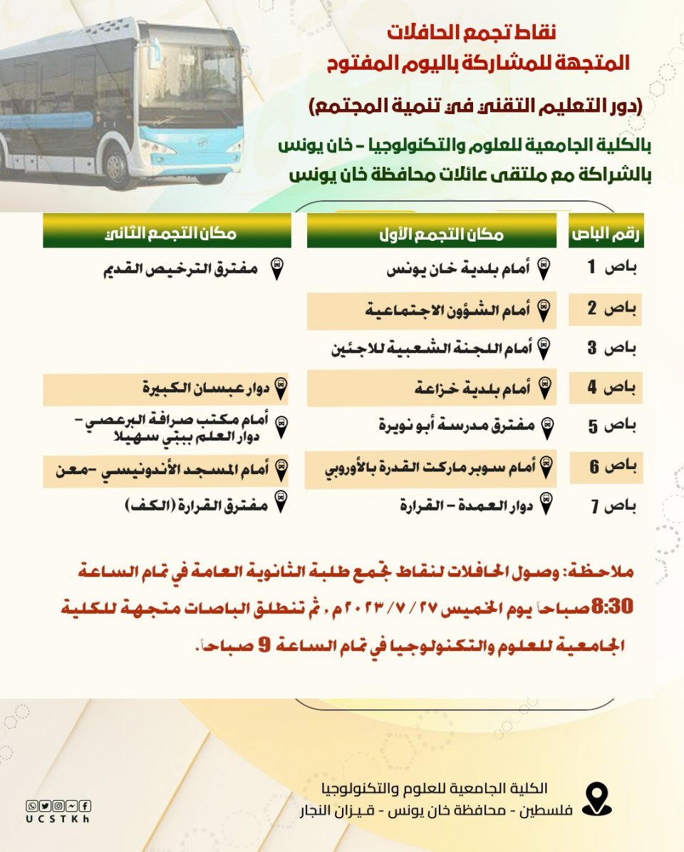 ملاحظة: وصول الحافلات لنقاط تجمع طلبة الثانوية العامة في تمام الساعة 8:30 صباحاً يوم الخميس 27/ 7/ 2023م , ثم تنطلق الباصات متجهة للكلية الجامعية للعلوم والتكنولوجيا في تمام الساعة 9 صباحاً.