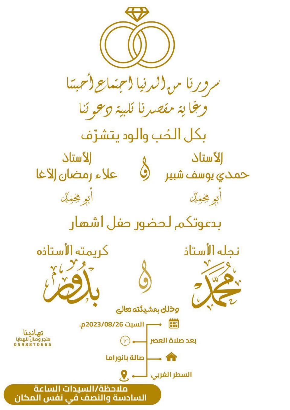 2023-08-27 ♥ بِسْمِ اللَّـهِ الرَّحْمَـٰنِ الرَّحِيمِ ♥ وَمِنْ آيَاتِهِ أَنْ خَلَقَ لَكُم مِّنْ أَنفُسِكُمْ أَزْوَاجًا لِّتَسْكُنُوا إِلَيْهَا وَجَعَلَ بَيْنَكُم مَّوَدَّةً وَرَحْمَةً إِنَّ فِي ذَلِكَ لَآيَاتٍ لِّقَوْمٍ يَتَفَكَّرُون♥ تم بحمد الله وتوفيقه عقد قران صاحبة الصون والعفاف ا. بدور علاء رمضان صالح عثمان الأغا إلى ا. محمد حمدي شبير ♥ بارك الله لكما وبارك عليكما وجمع بينكما فى خير.♥