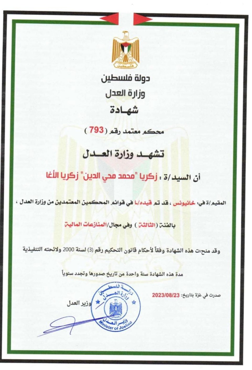 "وَإِذَا حَكَمْتُمْ بَيْنَ النَّاسِ أَنْ تَحْكُمُوا بِالْعَدْلِ إِنَّ اللَّهَ نِعِمَّا يَعِظُكُمْ بِهِ إِنَّ اللَّهَ كَانَ سَمِيعًا بَصِيرًا" تم بحمد الله حصول الاستاذ زكريا على رخصة مزاولة التحكيم المالي وقيده من ضمن المحكمين المعتمدين من وزارة العدل. وذلك للتحكيم في المنازعات و القضايا المالية و المحاسبية للتواصل عبر الجوال 0597706306 واتس 00972597706306
