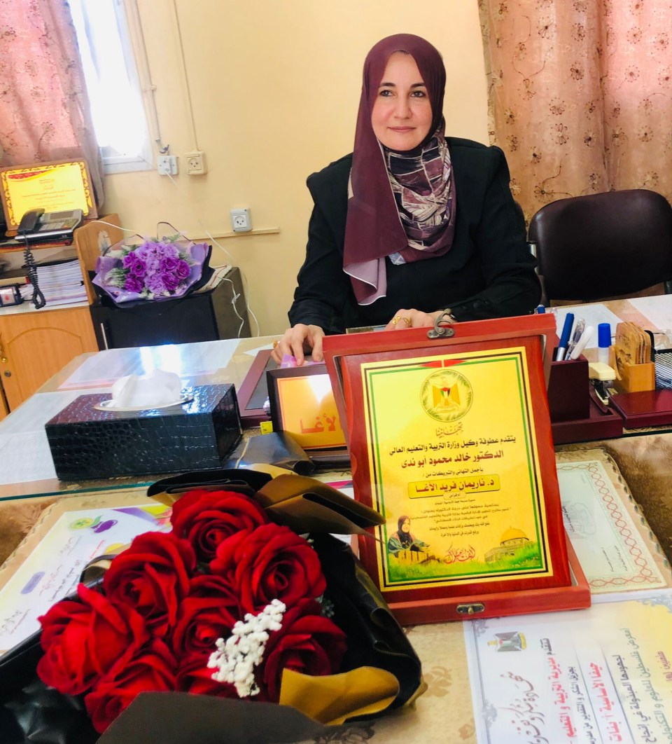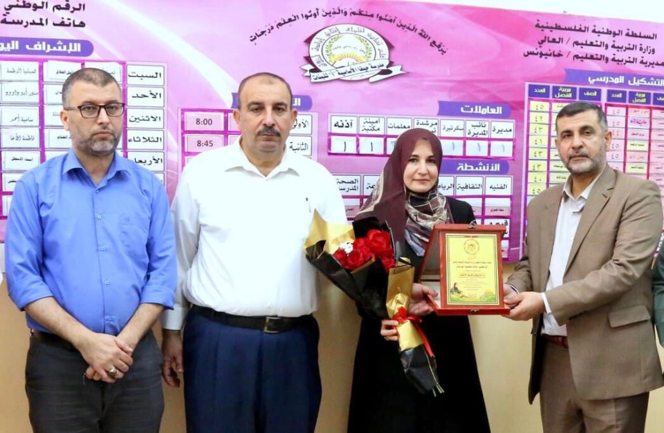 عطوفة وكيل وزارة التربية والتعليم العالي د. خالد أبو ندى يكرم د. ناريمان فريد الأغا مديرة مدرسة حيفا الأساسية أ للبنات بمناسبة حصولها على درجة الدكتوراة، وشارك في التكريم كل من: أ. محمد حمدان مدير التربية والتعليم خان يونس على التهنئة،و د. محمود مطر الوكيل المساعد للشؤون التعليمية، ود. أحمد أبو ندا الوكيل المساعد لشؤون التخطيط والتطوير، وأ. أحمد عايش النجار مدير عام وحدة العلاقات العامة والتعاون الدولي، وأ. رائد صالحية مدير عام الشؤون الإدارية، و د. إبراهيم رمضان مدير الدائرة الفنية، ود. خالد المزين مدير الدائرة الإدارية و أ. حنان طبش رئيس قسم العلاقات العامة و أ. أيمن عاشور رئيس قسم الأنشطة التربوية بمديرية التربية والتعليم خان يونس.