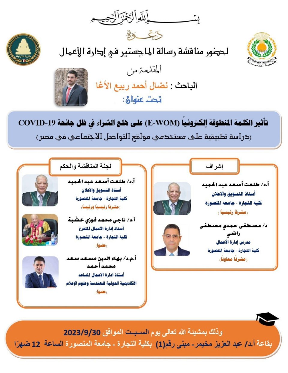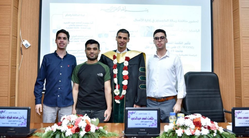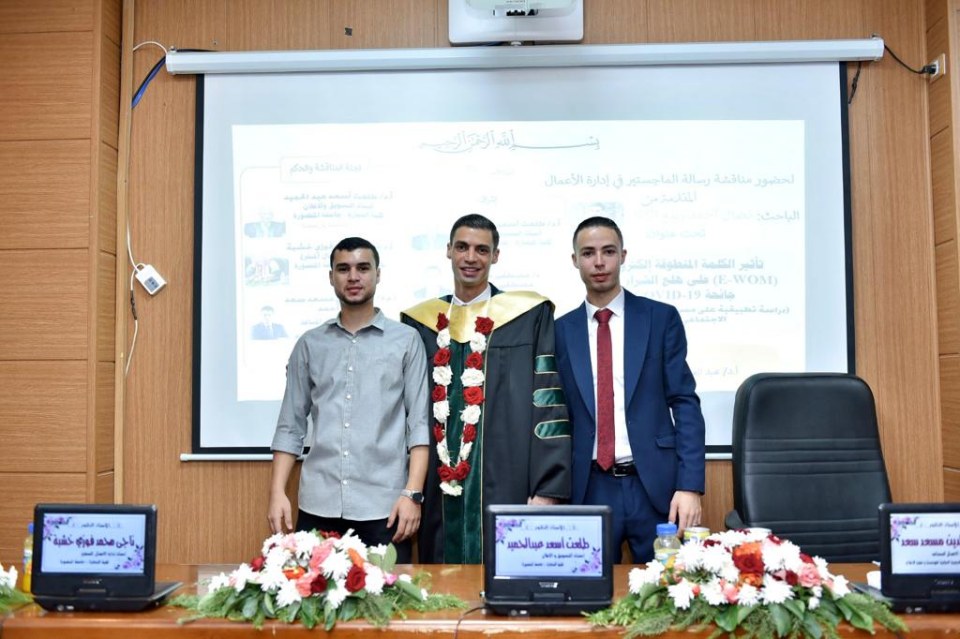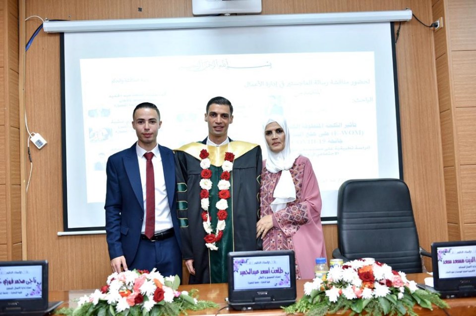 2023-10-01 تم بحمد الله وتوفيقه منح الأستاذ نضال أحمد ربيع سعيد عثمان الأغا درجة الماجستير تحت عنوان { تأثير الكلمة المنطوقة إلكترونياً (E-WOM) على هلع الشراء في ظل جائحة COVID-19 } تخصص ادارة اعمال من جامعة المنصورة مع أجمل التهاني والأمنيات بالمزيد من التوفيق والسداد والنجاح، سائلين الله عز وجل أن ينتفع به العباد والبلاد.