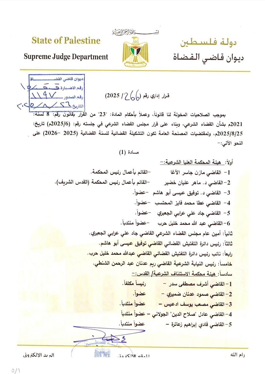 الرئيسة/تعينات وترقيات/تعيين الشيخ مازن الأغا قائما باعمال رئيس المحكمة العليا الشرعية تعينات وترقيات تعيين الشيخ مازن الأغا قائما باعمال رئيس المحكمة العليا الشرعية تاريخ النشر : الثلاثاء | 02-09-2025 | 22:11 1914 اضغط هنا للتواصل أو التعرف على الشيخ مازن جاسر حسين يوسف حسين الأغا يمكنك تلقي أحدث الأخبار أول بأول بانضمامك لإحدى مجموعات الواتساب الخاصة بالعائلة من خلال الضغط هنـا اظهر المزيد