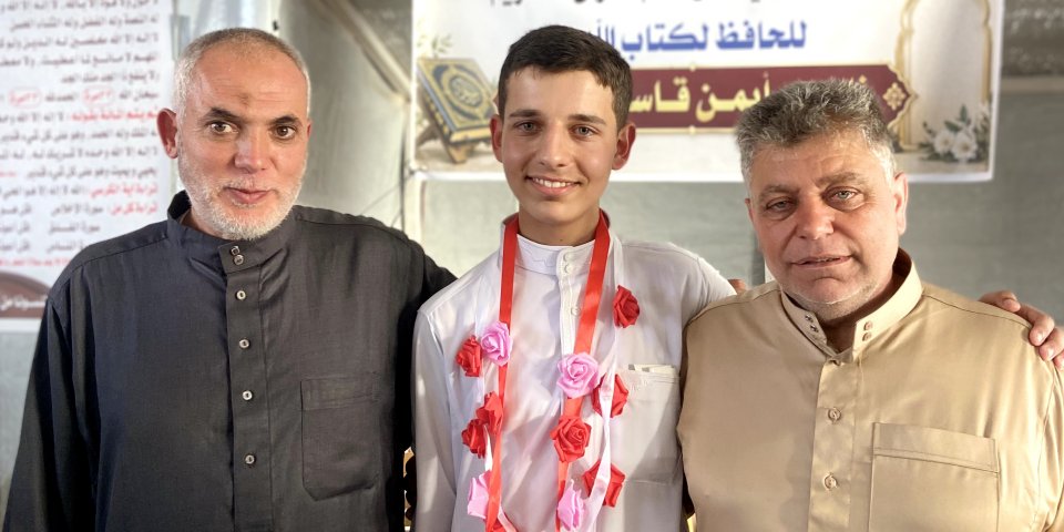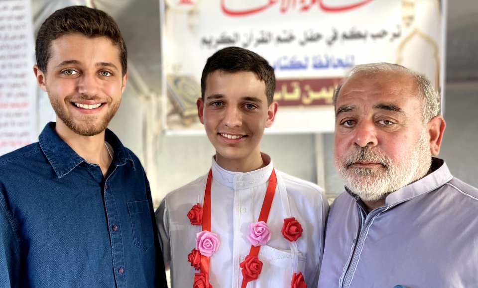 كما نتقدّم بخالص الشكر والتقدير لشيخه ومعلمه الشيخ إبراهيم زهير الأغا، الذي كان له بعد الله الأثر العظيم في هذا الإنجاز، ونبارك لوالديه الكريمين، سائلين الله أن يجزيهما خير الجزاء على دعمهما ودعائهما.. وإلى عمّه الأستاذ ناجي، الذي يحمل اسمه ويفتخر به، فكان الاسم قدوةً والأثر سندًا، جزاه الله خيرًا وبارك فيه.. ونسأل الله الرحمة والمغفرة لمن سبق من أهله وأحبابه، وأن يجعل هذا الإنجاز نورًا يصل إليهم، ورفعةً في درجاتهم.. كما نسأل الله أن يجمعه بأخيه وأحبّته في جنات النعيم، وأن يجعل القرآن شفيعًا لهم جميعًا..
