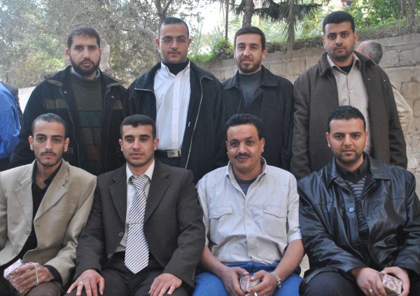 السادة الواقفون: م. سفيان الأغا،حسن سهيل البطة، أحمد طاهر الأغا، بهاء(شقيق العريس)، شادي البطة، اسماعيل (عم العريس)، العريس، غسان(عم العريس)، عيد محمد(إبن عم العريس).