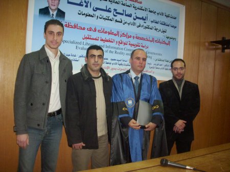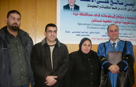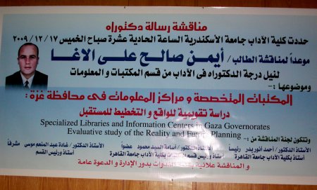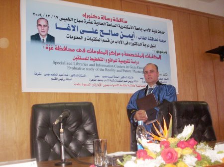 الإسكندرية- 17-12-2009 حصل الأستاذ أيمن صالح علي الأغا على درجة الدكتوراه بامتياز مع مرتبة الشرف الأولى, من كلية الأداب- جامعة الإسكندرية بجمهورية مصر العربية, وكانت الرساله بعنوان: