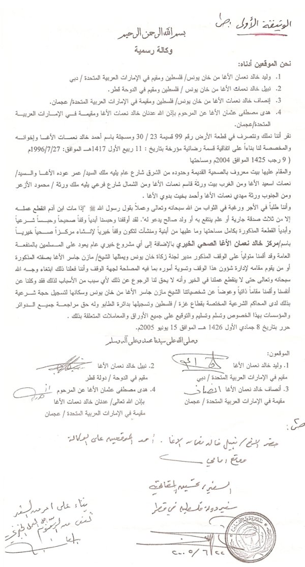 هذا وقد تم تحرير وكالة رسمية بهذا الخصوص بتاريخ 8 جمادي الأول 1426هـ الموافق 15 يونيو 2005م. وتم التوقيع عليها من قبل الأطراف الأربعة صاحبة الحق الشرعي في الوقف والحبس كل طرف باسمه الحقيقي باستثناء اخينا المرحوم عدنان خالد نعمان الأغا الذي أنابت عنه في التوقيع أرملته السيدة هدى مصطفى عثمان الأغا.