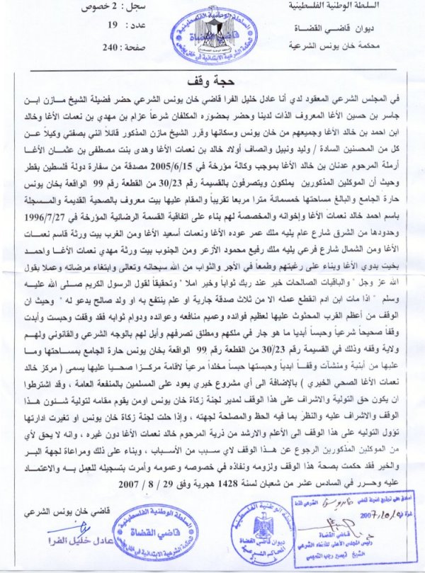 في المجلس الشرعي المعقود لدي أنا عادل خليل الفرا قاضي خان يونس الشرعي حضر فضيلة الشيخ مازن بن جاسر بن حسين الأغا المعروف الذات لدينا وحضر بحضوره المكلفان شرعا عزام بن مهدي بن نعمات الأغا وخالد ابن احمد بن خالد الأغا وجميعهم من خان يونس وسكانها وقرر الشيخ مازن المذكور قائلا انني بصفتي وكيلا عن كل من المحسنين السادة/وليد ونبيل وانصاف أولاد خالد بن نعمات الأغا وهدى بنت مصطفى بن عثمان الأغا أرملة المرحوم عدنان بن خالد الأغا بموجب وكالة مؤرخة في 15/6/2005 مصدقة من سفارة دولة فلسطين بقطر وحيث ان الموكلين المذكورين يملكون ويتصرفون بالقسيمة رقم 23/30 من القطعة رقم 99 الواقعة بخان يونس حارة الجامع والبالغ مساحتها خمسمائة متر مربع تقريبا والمقام عليها بيت معروف بالصحية القديمة والمسجلة باسم احمد خالد نعمات الأغا واخوانه والمخصصة لهم بناء على اتفاقية القسمة الرضائية المؤرخة في 27/7/1996 وحدودها من الشرق شارع عام يليه ملك عمر عودة الأغا ونعمات اسعيد الأغا ومن الغرب بيت ورثة قاسم نعمات الأغا ومن الشمال شارع فرعي يليه ملك رفيع محمود الأزعر ومن الجنوب بيت ورثة مهدي نعمات الأغا واحمد بخيت بدوي الأغا وبناء على رغبتهم وطمعا في الأجر والثواب من الله سبحانه وتعالى وابتغاء مرضاته وعملا بقول ا لله عز وجل "والباقيات الصالحات خير عند ربك ثوابا وخير أملا" وتحقيقا لقول الرسول الكريم صلى الله عليه وسلم "إذا مات ابن آدم انقطع عمله إلا من ثلاث صدقة جارية أو علم ينتفع به أو ولد صالح يدعو له"، وحيث ان الوقف من أعظم القرب المحثوث عليها لعظيم فوائده وعميم منافعه وعوائده ودوام ثوابه فقد وقفت وحبست وأبدت وقفا صحيحا شرعيا وحبسا ابديا ما هو جار في ملكهم ومطلق تصرفهم وأيل لهم بالوجه الشرعي والقانوني ولهم ولاية وقفه وذلك في القسيمة رقم 23/30 من القطعة رقم 99 الواقعة بخان يونس حارة الجامع بمساحتها وما عليها من أبنية ومنشآت وقفا أبديا وحبستها حبسا مخلدا مرعيا لإقامة مركز صحي عليها يسمى (مركز خالد نعمات الأغا الصحي الخيري) بالاضافة الى أي مشروع خيري يعود على المسلمين بالمنفعة العامة، وقد اشترطوا ان يكون حق التولية والاشراف على هذا الوقف لمدير لجنة زكاة خان يونس او من يقوم مقامه لتولية شؤون هذا الوقف والاشراف عليه والنظر بما فيه الحظ والمصلحة لجهته، واذا حلت لجنة زكاة خان يونس أو تغيرت ادارتها تؤول التولية على هذا الوقف الى الأعلم والارشد من ذرية المرحوم خالد نعمات الأغا دون غيره، وانه لا يحق لأي من الموكلين المذكورين الرجوع عن هذا الوقف لأي سبب من الأسباب، وبناء على ذلك ومراعاة لجهة البر والخير فقد حكمت بصحة هذا الوقف ولزومه ونفاذه في خصوصه وعمومه وأمرت بتسجيله للعمل به والاعتماد عليه وحرر في السادس عشر من شعبان لسنة 1428 هجرية وفق 29/8/2007