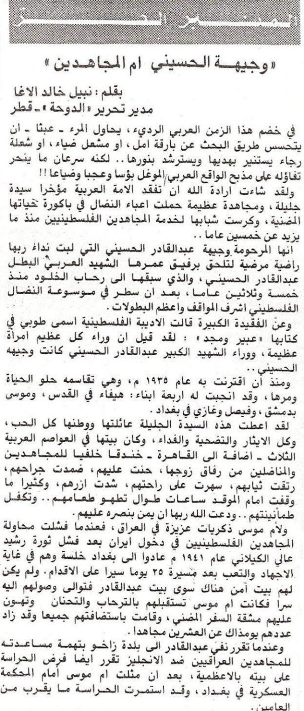 جريدة «الدستور» الأردنية، بعد نحو أسبوعين من وفاة السيدة المجاهدة وجيهة الحسيني زوجة رائد الكفاح المسلح في فلسطين الشهيد عبدالقادر الحسيني.