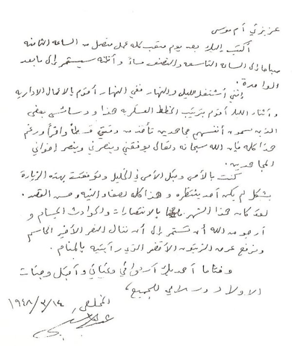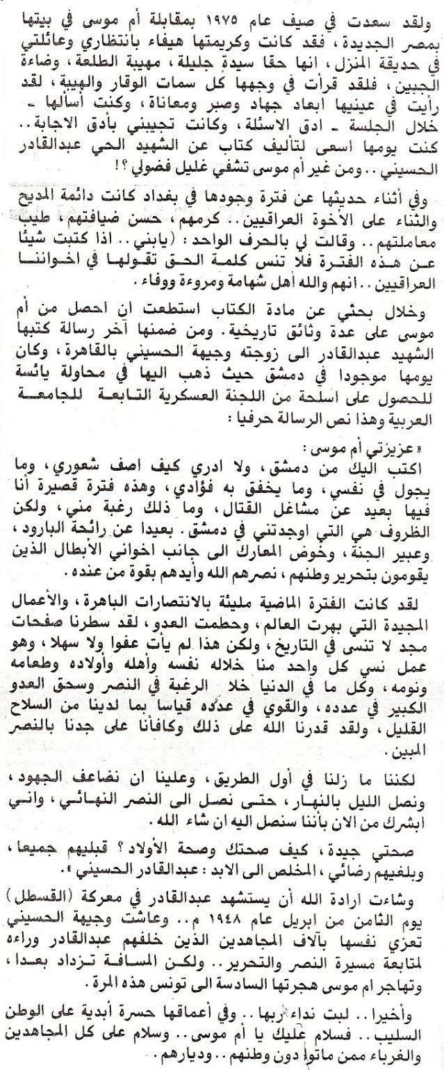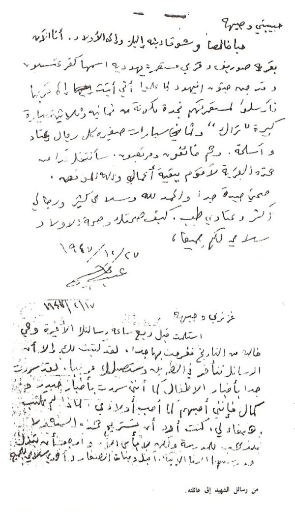 وخلال بحثي عن مادة الكتاب استطعت أن أحصل من أم موسى على عدة وثائق تاريخية. ومن ضمنها آخر رسالة كتبها الشهيد عبدالقادر إلى زوجته وجيهة الحسيني بالقاهرة، وكان يومها موجودا في دمشق حيث ذهب إليها في محاولة يائسة للحصول على أسلحة من اللجنة العسكرية التابعة للجامعة العربية وهذا نص الرسالة حرفيا: