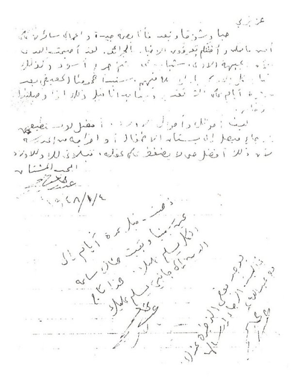 صحتي جيدة، كيف صحتك وصحة الأولاد؟ قبليهم جميعا، وبلغيهم رضائي، المخلص إلى الأبد: عبدالقادر الحسيني».