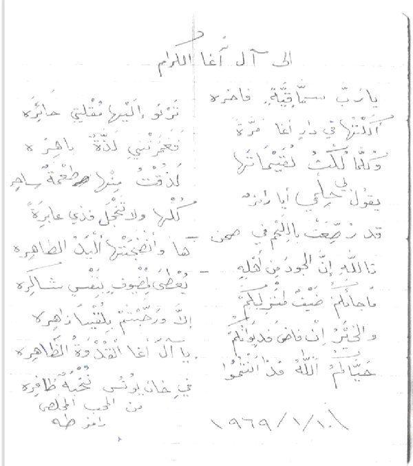 كان من بعض معارفه رجلاً أديباً ومعلّماً ومفتشاً في مديرية التربية في غزة واسمه الأستاذ رامز طه – رحمه الله تعالى - ربما يعرفه بعض كبارنا في العائلة ، وكان بين فترة وأخرى يزوره في البلد لعدة أيام ، فإذا كانت الزيارة في الشتاء كان ينام في بيتنا في ميدان الجندي المجهول ، وإذا كانت الزيارة صيفاً كان أحياناً ينام في الديوان في الطابق الأرضي ، وكان هذا الرجل رحمه الله تعالى يحب الوالد ويحب عائلة الآغا ، وقد كتب قصيدة في آل الآغا وفي‘‘ السماقيّة !! ’’ الأكلة الطيّبة التي نعرفها جميعنا ، وقد كانت الوالدة رحمها الله تعالى تحضرها وتطبخها بناءً على طلبه ورغبته لمحبته لتلك الأكلة ، وأرفق صورة عن تلك القصيدة بخط يد الأستاذ رامز نفسه رحمه الله تعالى عن عائلة الآغا والسماقيّة !!.
