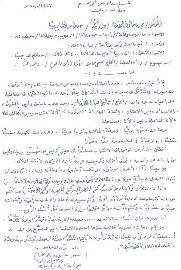 الرئيسة/في ذمة الله/رثاء الفقيد الحاج صبحي حافظ الأغا- رحمه الله في ذمة الله رثاء الفقيد الحاج صبحي حافظ الأغا- رحمه الله تاريخ النشر : الأحد | 25-04-2010 | 08:05 7608 اضغط هنا للتعرف على المرحوم الحاج صبحي حافظ عثمان الأغا يمكنك تلقي أحدث الأخبار أول بأول بانضمامك لإحدى مجموعات الواتساب الخاصة بالعائلة من خلال الضغط هنـا اظهر المزيد