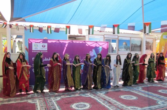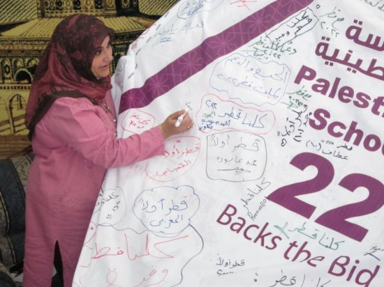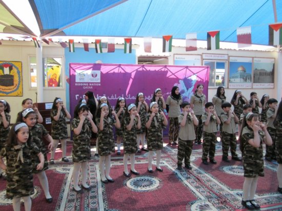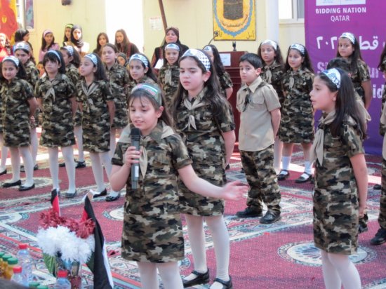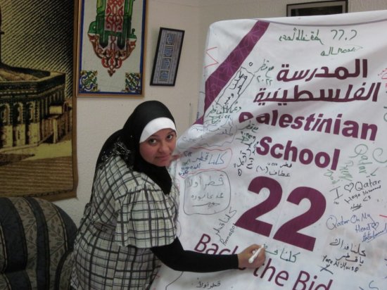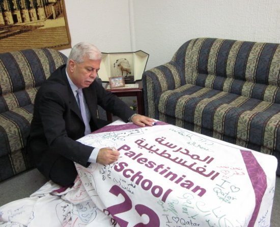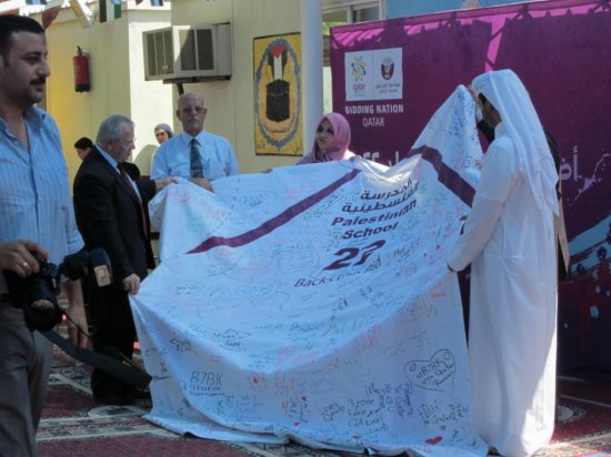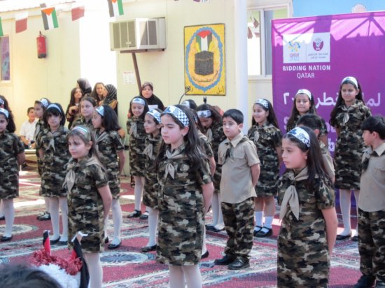من المدرسة الفلسطينية نقول لكم ورسالتنا إلى قطر من خلال سعادة الشيخ / محمد بن حمد بن خليفة إن قطر ستحضن كأس العالم لكرة القدم، ونحن معكم قلباً وعملاً وفكراً ، رافعين شعار( كلنا قطر).
